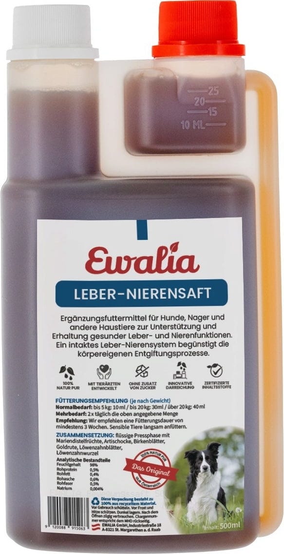The liver-kidney juice supports the cleansing and detoxification processes of the liver and kidney system for dogs, rodents and other pets. Regular use can have a positive effect on their fur and skin.