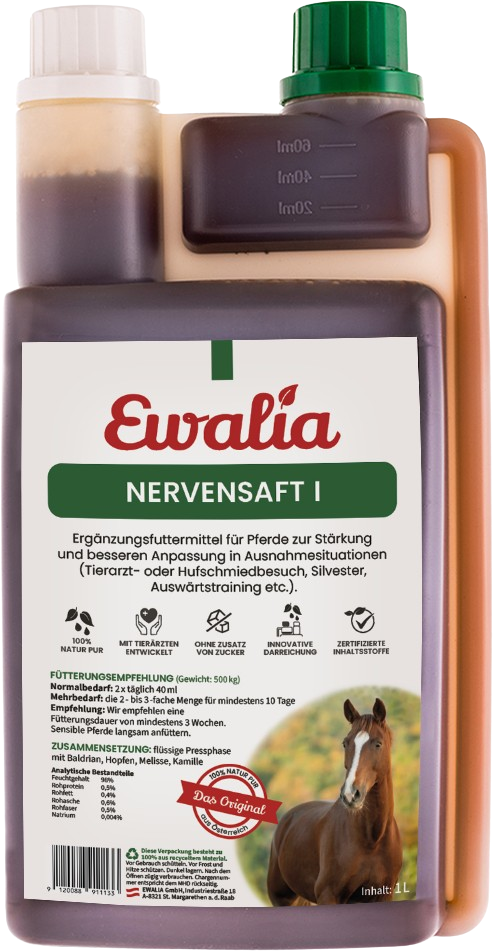 Exceptional situations like when you're moving house, New Year's Eve, having to stay in the stable for longer periods of time or visiting a veterinarian can cause stress. Nerve Juice I can relieve tension when your horse is experiencing fear, stress and tension.